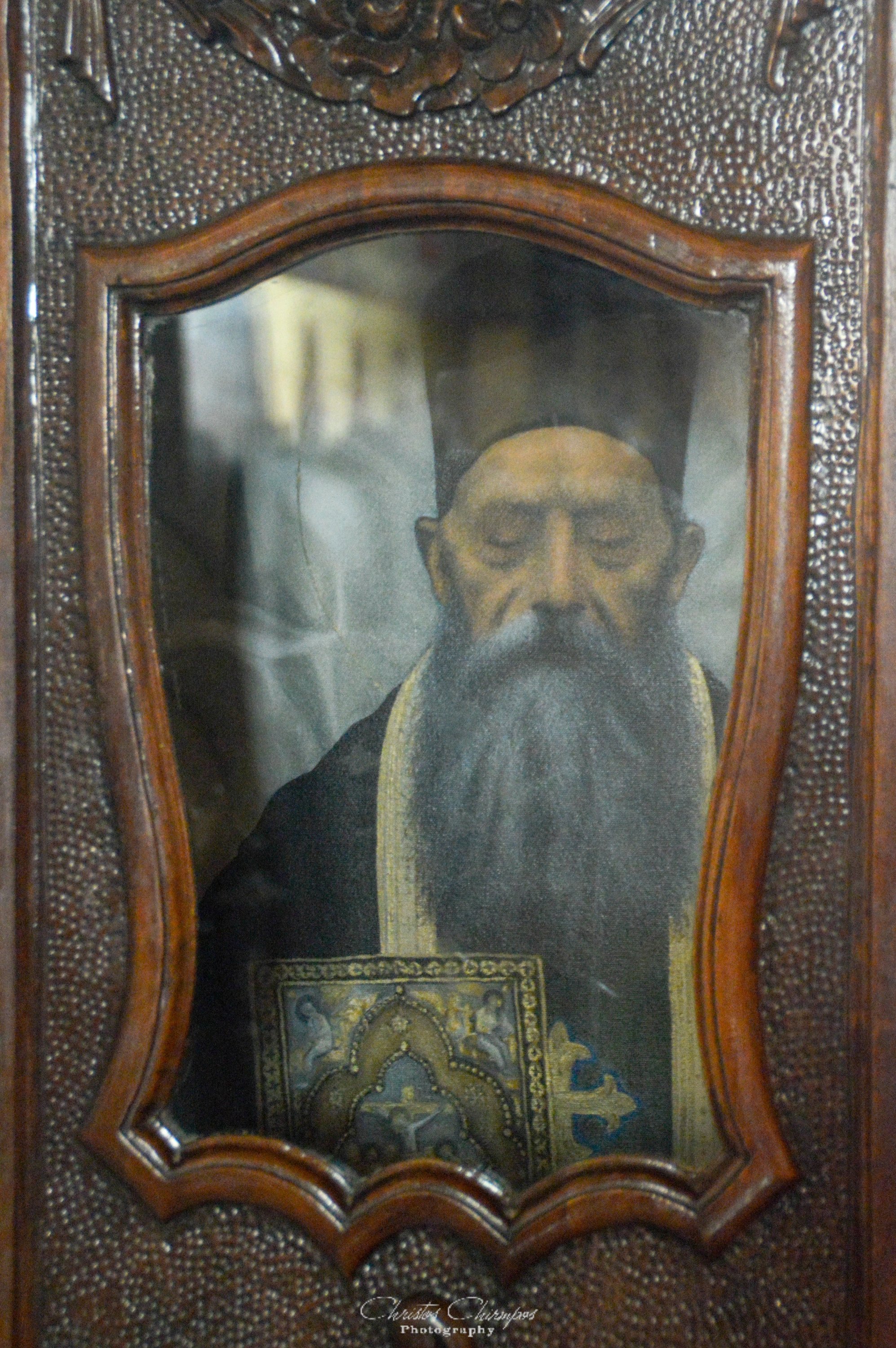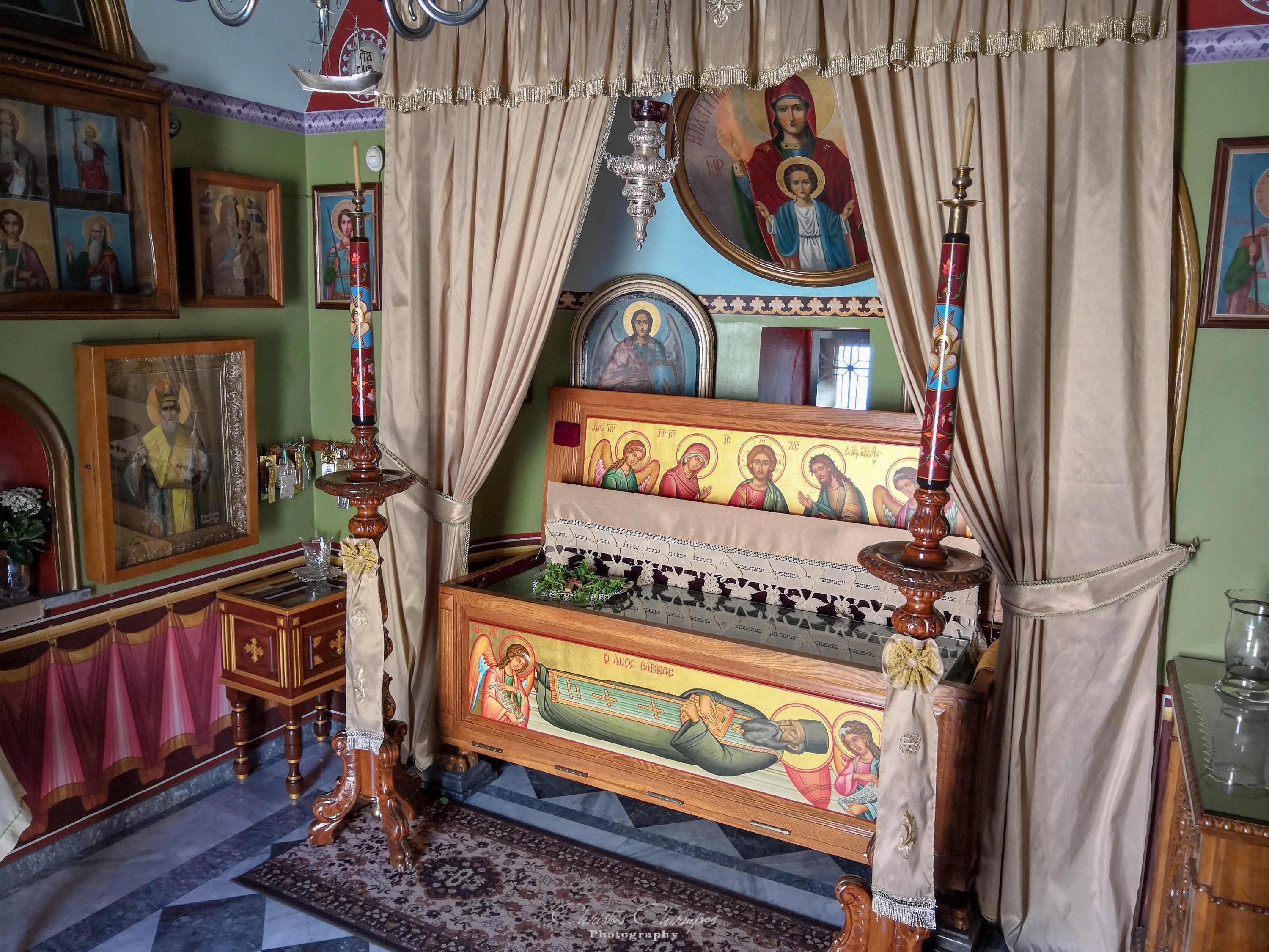 (Στις φωτογραφίες θα δείτε το κελί που έζησε, κάποια από τα προσωπικά του αντικείμενα, πολλά τάματα, καθώς επίσης και τη γυάλινη λάρνακα με το ιερό λείψανο του Αγίου)