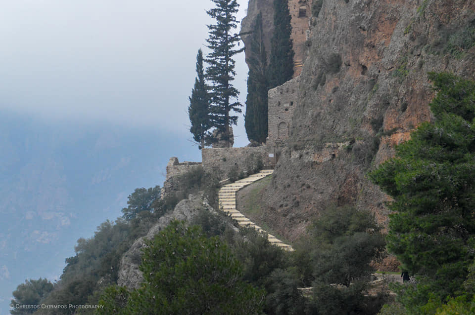 Μετά το προσκύνημά μας στη θαυματουργή εικόνα, την Κάρα του Οσίου Λεοντίου και στα Άχραντα Πάθη του Κυρίου μας, κεραστήκαμε στο αρχονταρίκι της Ι.Μ. Παμμεγίστων Ταξιαρχών και πήραμε το μονοπάτι που οδηγεί στο Παλαιομονάστηρο του Οσίου Λεοντίου.