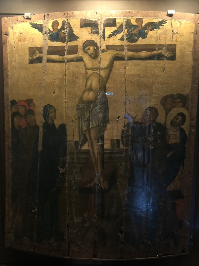 Η εικόνα της Σταύρωσης είχε κλαπεί το Νοέμβριο του 1979 από τρεις αρχαιοκάπηλους, οι οποίοι προκάλεσαν σοβαρότατες ζημιές στην εικόνα, εφόσον αφαίρεσαν το μουσαμά με την αγιογραφία και έπειτα τεμάχισαν την εικόνα.
