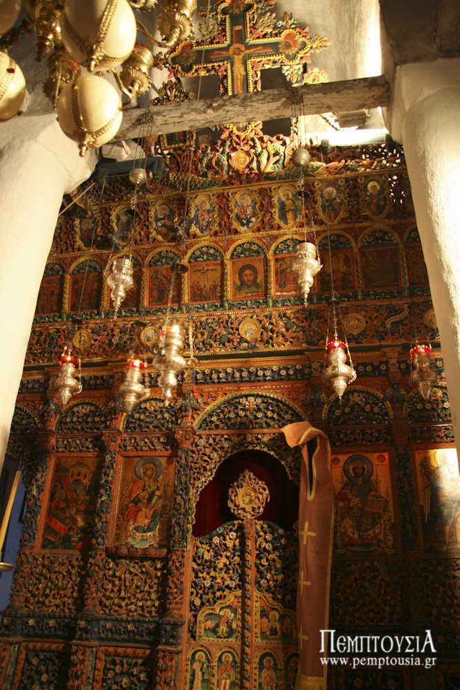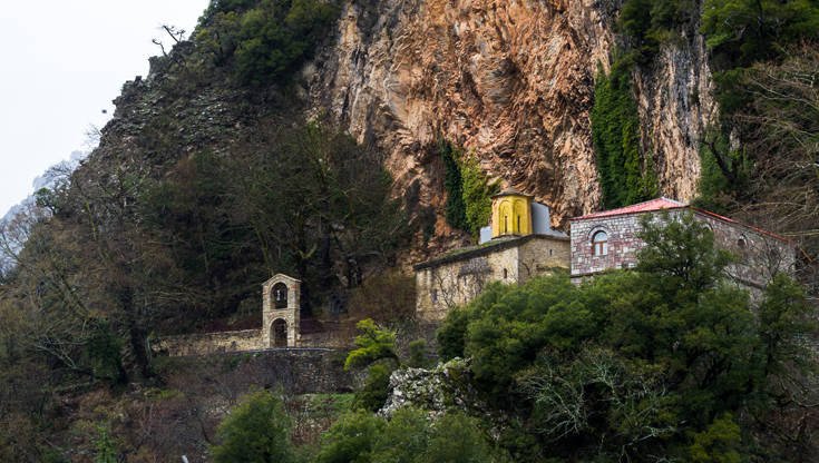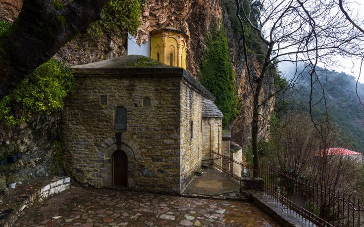 Το συγκρότημα είναι περιορισμένο λόγω της στενότητας του χώρου, μάλιστα κοιτάζοντας κανείς από χαμηλά βλέπει μόνο τον κομψό τρούλο του καθολικού, με τα στενόμακρα παράθυρα. Ο ναός, που χρονολογείται στον 18ο αιώνα, είναι μικρός σε διαστάσεις, σταυροειδής εγεγγραμμένος με τρούλο και ανήκει σε παραλλαγή του αθωνικού τύπου ναού, που έχει δύο κόγχες στους πλάγιους τοίχους. Το εσωτερικό του είναι διακοσμημένο με τοιχογραφίες που διατηρούνται σε αρκετά σημεία, παρά τη φθορά που έχουν υποστεί από την υγρασία του σπηλαίου, με κυρίαρχη μορφή αυτή του Παντοκράτορα στον τρούλο. Ενδιαφέρον είναι το μικρό αλλά κομψό ξυλόγλυπτο τέμπλο, του οποίου οι εικόνες, όπως και οι υπόλοιπες που υπάρχουν μέσα στον ναό, είναι έργα σπουδαίων αγιογράφων της σχολής των Αγράφων, όπως ο Θεοφάνης και ο Διονύσιος.