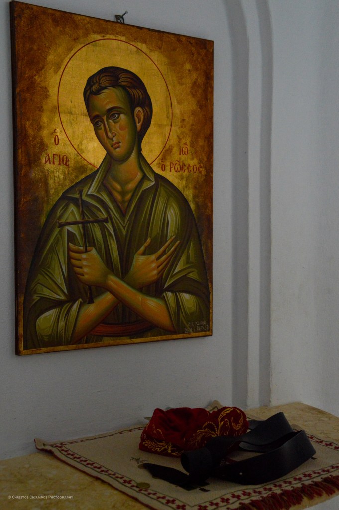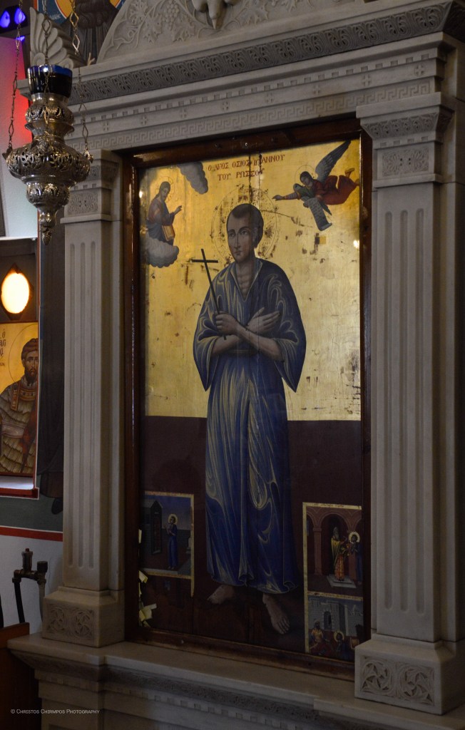 Στον Ιερό Ναό του Οσίου Ιωάννη του Ρώσου φυλάσσονται αρκετές εικόνες, μερικές εκ των οποίων μεταφέρθηκαν από τους πρόσφυγες από τη Μικρά Ασία. Μια από αυτές είναι η αρχαιότερη εικόνα του Οσίου Ιωάννου του Ρώσου, που προσδιορίζεται χρονικά γύρω στο 1790 και αποτελεί αγιογραφία μεταβυζαντινής τέχνης. Σε αυτήν εικονίζεται ο Άγιος σε νεαρή ηλικία. Ακόμη φυλάσσεται η εικόνα της Θείας Λειτουργίας, που αγιογραφήθηκε το 1884, η εικόνα της Δέησης με το Χριστό ένθρονο, ως Μέγα Αρχιερέα, έργο του 19ου αιώνα, η εικόνα της Θεοτόκου, τύπου «Ρόδον το αμάραντον», έργο του 19ου αιώνα, η εικόνα της Παναγίας του Κύκκου, ο Ακάθιστος Ύμνος, εικόνα που περιλαμβάνει τρία θέματα, με κέντρο αναφοράς το πανάγιο πρόσωπο της Άνασσας Θεοτόκου, η εικόνα των Τριών Ιεραρχών του 19ου αιώνα, η Θυσία του Αβραάμ, ο Άγιος Χαράλαμπος, ο Άγιος Ιωάννης ο Πρόδρομος, ο Μέγας Βασίλειος, ο Άγιος Ευστάθιος, ο Άγιος Μεγαλομάρτυρας Προκόπιος και η εικόνα του Οσίου Ιωάννη του εκ Ρωσίας του Ομολογητού.