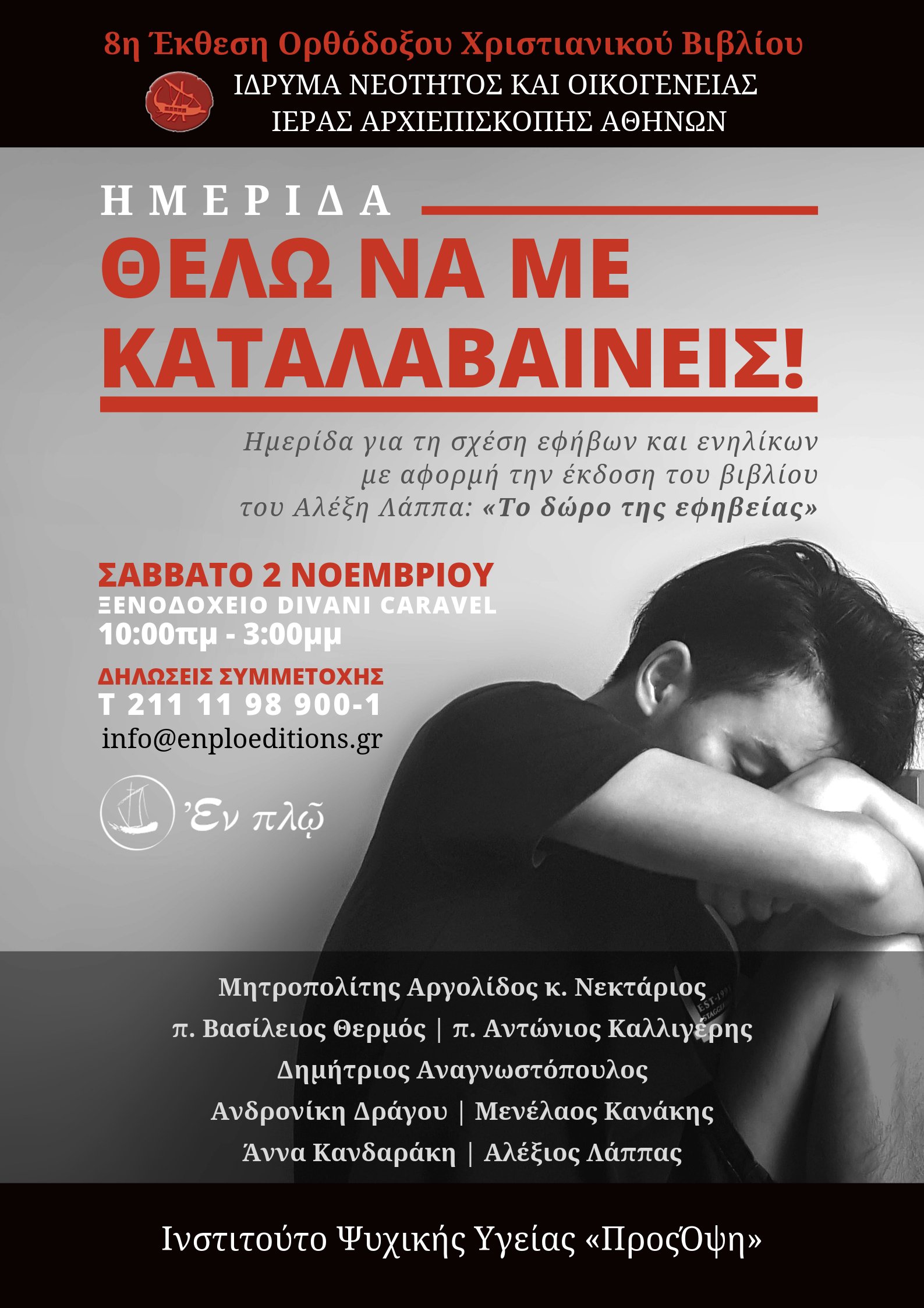 Η Διεύθυνση Ποιμαντικής Γάμου και Οικογένειας, η οποία είναι ενταγμένη στο Ίδρυμα Νεότητας και Οικογένειας της Ιεράς Αρχιεπισκοπής Αθηνών, οι Εκδόσεις Εν Πλω και το Ινστιτούτο Ψυχικής Υγείας «ΠροσΌψη», στο πλαίσιο της 8ης Έκθεσης Ορθόδοξου Χριστιανικού Βιβλίου, (2-4 Νοεμβρίου 2019) στο Ξενοδοχείο Divani Caravel, διοργανώνουν Ημερίδα το Σάββατο 2 Νοεμβρίου, με θέμα: