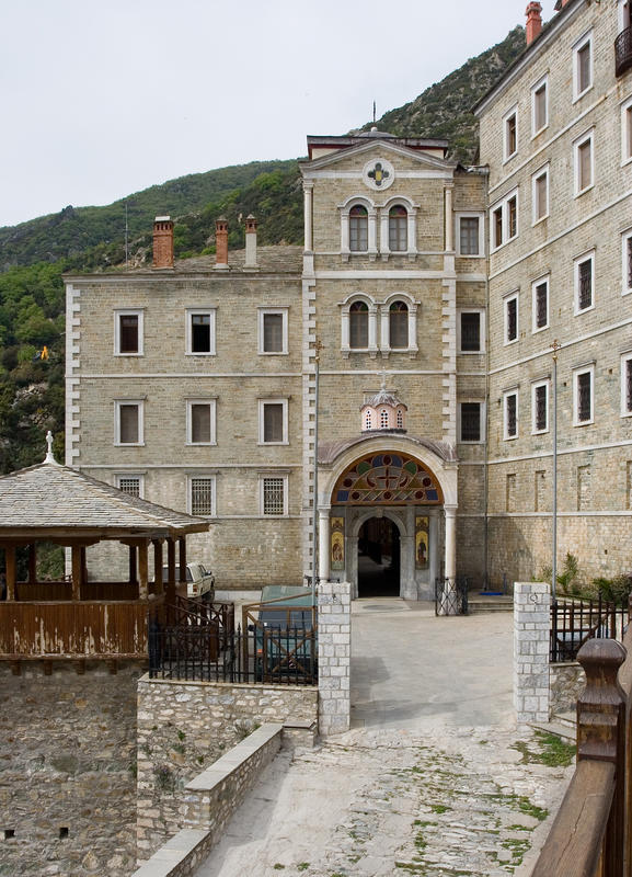 Το Καθολικό τιμάται στις 2 Φεβρουαρίου στην Υπαπαντή του Κυρίου. Εγκαινιάστηκε ανήμερα του Αγίου Γεωργίου και κτίστηκε στα 1817-1845. Η Τράπεζα χτίστηκε στα 1902-1903 χωρίς να τοιχογραφηθεί. Η Μονή έχει γύρω στα 10 παρεκκλήσια, μεταξύ των οπίων το παρεκκλήσι του Αγίου Γεωργίου με τοιχογραφίες του 15ου αιώνα. Επίσης έχει 3 Κελιά στις Καρυές, 2 Σκήτες, την Ρουμανική Σκήτη του Λάκκου αφιερωμένη στον Άγιο Δημήτριο που αποτελείται από 2 Καλύβες και τη Νέα Σκήτη.