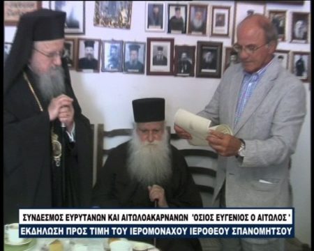Την Κυριακή 22 Ιουνίου 2014, ο Σύνδεσμος Αιτωλοακαρνάνων «ΟΣΙΟΣ ΕΥΓΕΝΙΟΣ Ο ΑΙΤΩΛΟΣ» και οι φίλοι της Ιεράς Μονής Αγίας Ελεούσας, τίμησαν τον μακαριστό Ιερομόναχο π. Ιερόθεο Σπανομήτσο για τα 60 χρόνια διακονίας του στην Αγία Ελεούσα. Το πρωί τελέσθηκε Θεία Λειτουργία στον Ιερό Ναό του Αγίου Αντωνίου στα Φραγκουλέικα, Ιερουργούντος του Σεβασμιωτάτου Μητροπολίτου Αιτωλίας και Ακαρνανίας κ.κ. Κοσμά, παρουσία μελών του Συνδέσμου και πλήθους πιστών. Με το πέρας της Θείας Λειτουργίας, ακολούθησε στο Αρχονταρίκι της Ιεράς Μονής η σεμνή τελετή, έτσι όπως την ήθελε και ο γέροντας π. Ιερόθεος. Ακολούθησε η απονομή Τιμητικής Διάκρισης εκ μέρους του Συνδέσμου, από τον Σεβασμιώτατο Μητροπολίτη κ.κ. Κοσμά στον π. Ιερόθεο. Η διάκριση απονέμεται για το Ορθόδοξο φρόνημα, το Χριστιανικό Ήθος, το Κοινωνικό, Ανθρωπιστικό και Ποιμαντικό έργο, που επέδειξε διακονώντας επί εξήντα έτη την Ιερά Μονή Αγίας Ελεούσας.