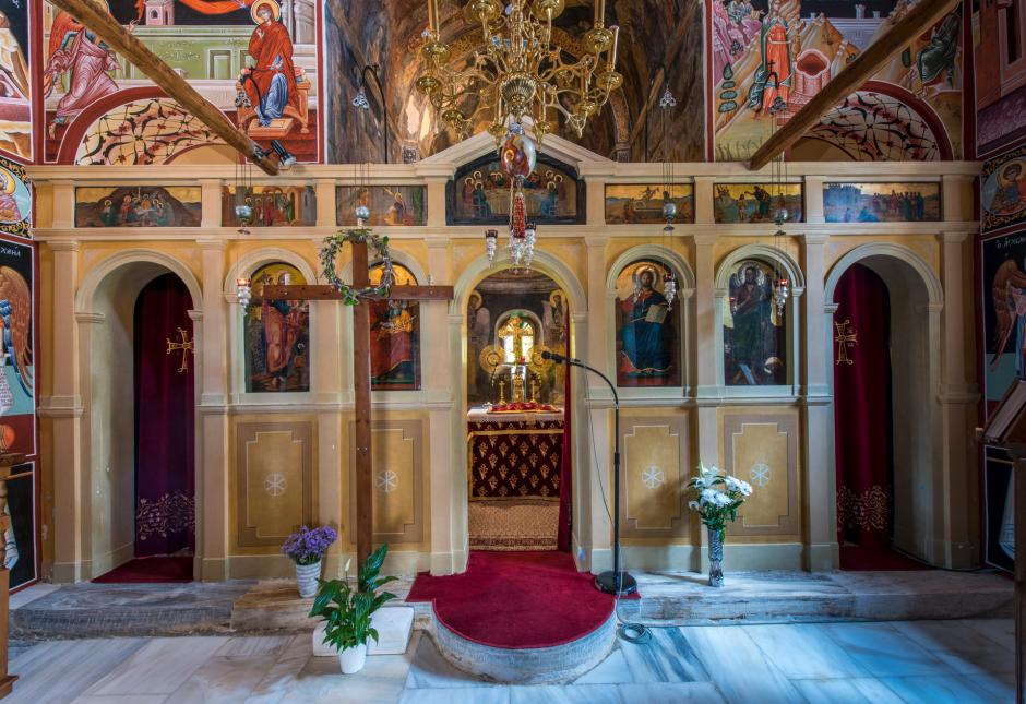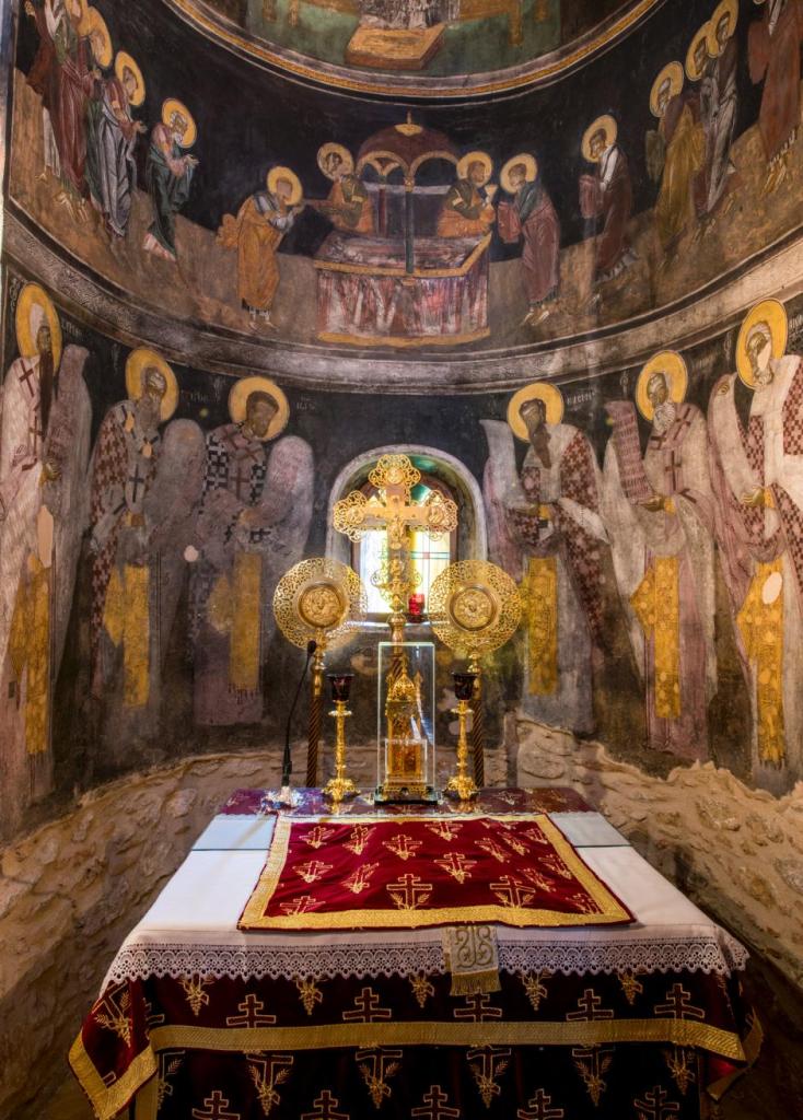 Στο εσωτερικό του σώζονται σε αρκετά μεγάλο βαθμό τοιχογραφίες, τα θέματα των οποίων περιλαμβάνουν τους καθιερωμένους κύκλους, την παράσταση της Κοινωνίας των Αποστόλων και σκηνές θαυμάτων του Χριστού. Τοιχογραφικές παραστάσεις διατηρούνται και στο εσωτερικό της κυρίως τράπεζας, ενός από τους χώρους της τράπεζας, που είναι επίμηκες ορθογώνιο κτίσμα και διαθέτει ακόμη δύο δωμάτια, την εστία και το οψοφυλάκιο (χώρος αποθήκευσης τροφίμων)