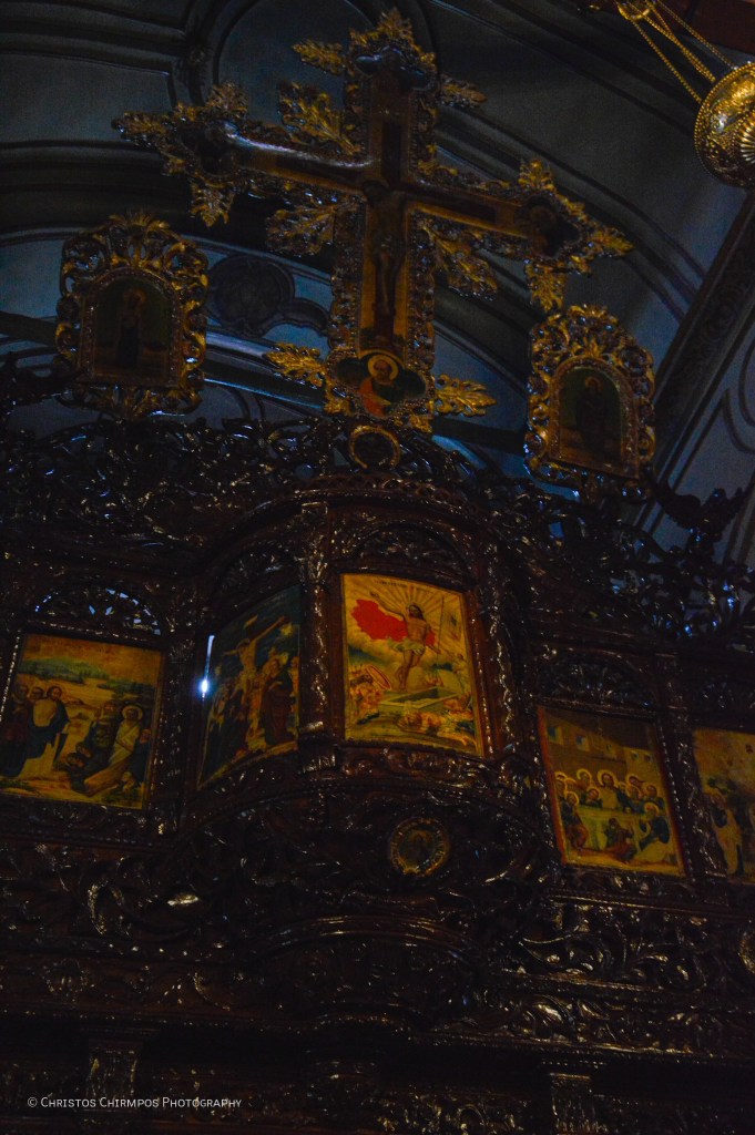 Το Καθολικό είναι ρυθμού τρίκλιτης Βασιλικής (1808), αφιερωμένο στην Κοίμηση της Θεοτόκου, τον Άγιο Διονύσιο και τον Άγιο Χαράλαμπο. Εντυπωσιακό είναι το ξυλόγλυπτο τέμπλο με τις εντυπωσιακές παραστάσεις από την Παλαιά Διαθήκη, μορφές αγίων, αγγέλων, ευαγγελιστών κ.λπ. Βόρεια από το Καθολικό υψώνεται αγέρωχος ο μεγάλος πύργος της μονής, που ανοικοδομήθηκε για την προστασία από τους πειρατές.
