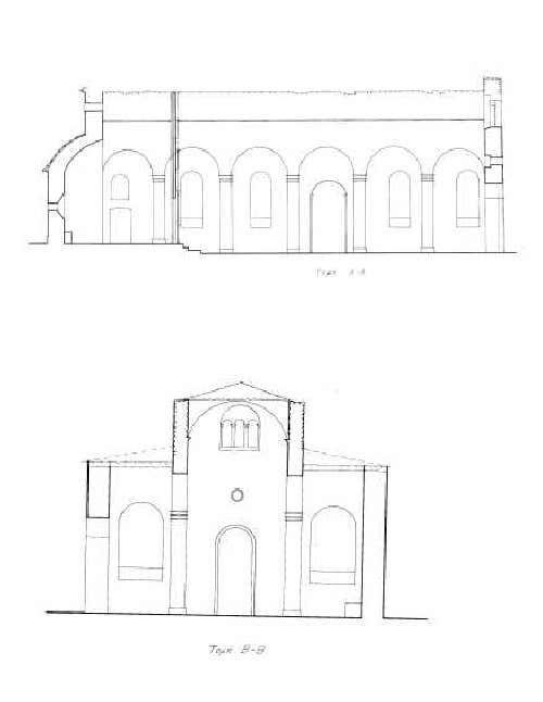 Πάνω σε κάθε τοξοστοιχία υψώνονται οι τοίχοι του υπερυψωμένου κεντρικού κλίτους, μέσα στο οποίο εγγράφεται η οροφή, η οποία ήταν ημικυλινδρική καμάρα από μπαγδατί. Η κορυφή της καμάρας βρισκόταν σε ύψος 9,25 μ. από το δάπεδο του ναού. Το δυτικό τμήμα της διατηρούνταν μέχρι το 1985. Το περίγραμμά της είναι σήμερα εμφανές στο δυτικό τοίχο του κεντρικού κλίτους, ενώ υπολείμματα από το μπαγδατί σώζονται στο νότιο τοίχο. Τα πλάγια κλίτη είχαν οριζόντιο ξύλινο ταβάνι από μπαγδατί, σε ύψος 6,60μ., το οποίο διατηρείται υπό κατάρρευση στο βόρειο κλίτος.