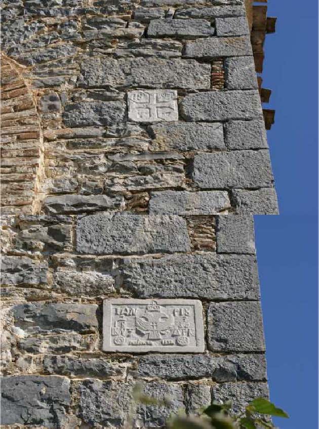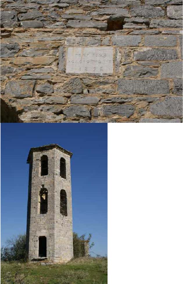 Η παλαιότερη χρονολογικά ενεπίγραφη πλάκα είναι εντοιχισμένη στη δυτική πλευρά του ναού. Φέρει μέσα σε πλαίσιο από επίπεδη ταινία λιθανάγλυφο δικέφαλο αετό,δεξιά και αριστερά του οποίου αναπτύσσεται σε πέντε στίχους η επιγραφή: ΙΑΝ(ΟΥΑ) ΡΙΟΥ/ 2 3/ 18 60/ ΙΚΝΣΤ ΔΡΚ/ ΜΑΪΟΥ 201855. Οι κάτω γωνίες κοσμούνται με πεντάλφα αριστερά και αστέρι δεξιά. Τα κεφαλαία γράμματα στον τρίτο στίχο αποτελούν αρχικά ονομάτων αφιερωτών ή ίσως συντομογραφία ονόματος και επιθέτου ενός αφιερωτή.