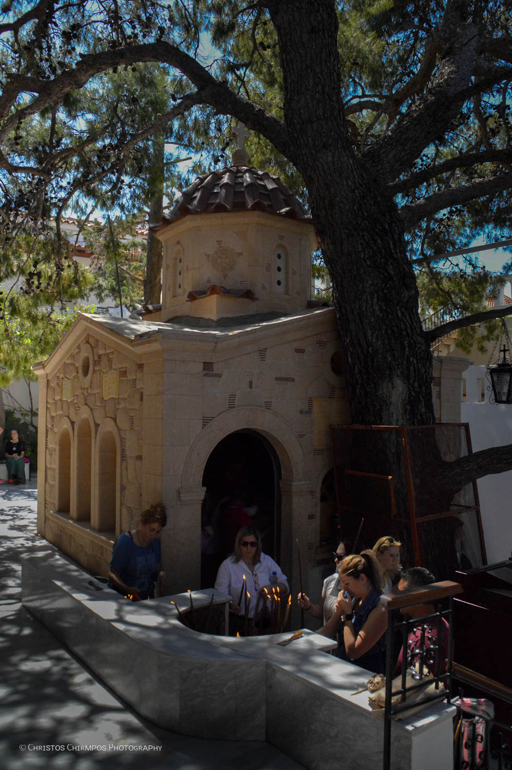 Ο μικρός σε μέγεθος ναός είναι Βυζαντινού ρυθμού και δίπλα σε αυτόν υπάρχει μια εκκλησία αφιερωμένη στον Άγιο Νεκτάριο. Εκεί υπάρχουν οι θήκες με την Αγία Κάρα και τα λείψανα του αγίου. Δεξιότερα ο προσκυνητής θα δει έναν μεγάλο πεύκο. Αυτόν τον έχει φυτέψει ο ίδιος ο Άγιος Νεκτάριος και στη σκιά του υπάρχει εκκλησάκι μέσα στο οποίο προστατεύεται ο τάφος του Αγίου. Ο Άγιος “κοιμήθηκε” στις 9 Νοεμβρίου του 1920.Το σώμα του Αγίου έμεινε ακέραιο για 21 χρόνια. Οι μοναχές άλλαζαν ράσα και με αυτά έφτιαχναν φυλακτά. Η ανακομιδή των λειψάνων έγινε στις 3 Σεπτεμβρίου του 1963.