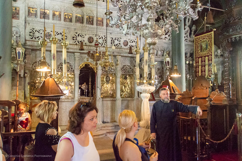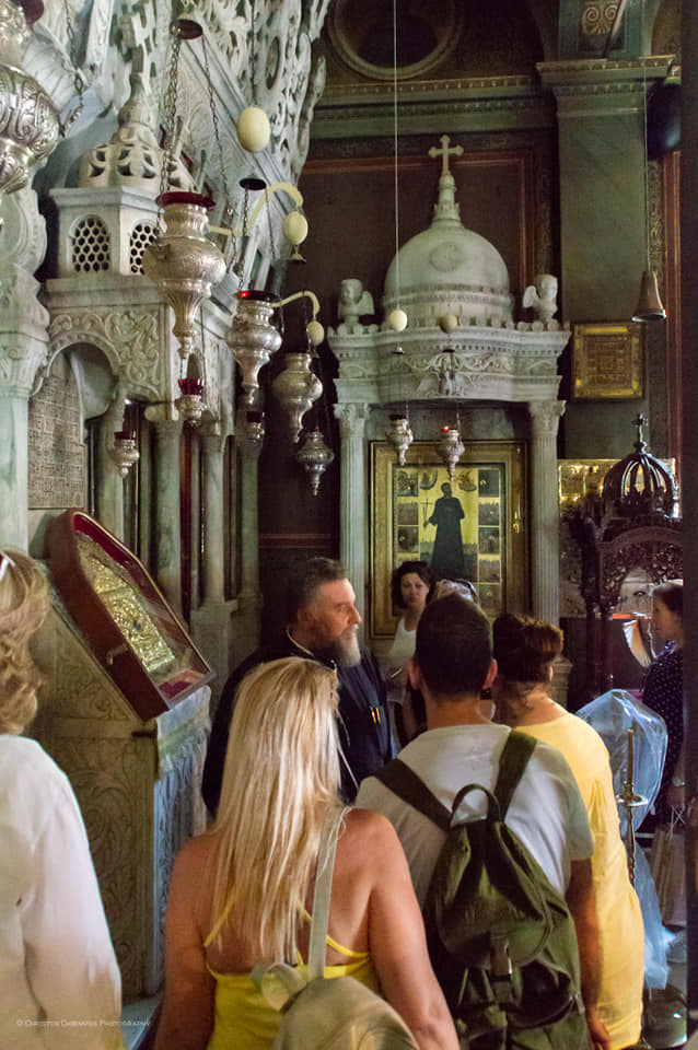 Το ναό κοσμεί χρυσός εξάφωτος πολυέλαιος, που κοσμείται με τις κεφαλές των Λουδοβίκων της Γαλλίας, τον οποίο όπως λέγεται, πήρε ο Παύλος Κουντουριώτης από τον πλοίαρχο Σαρκώση, που με τη σειρά του τον είχε πάρει από τις Βερσαλλίες.