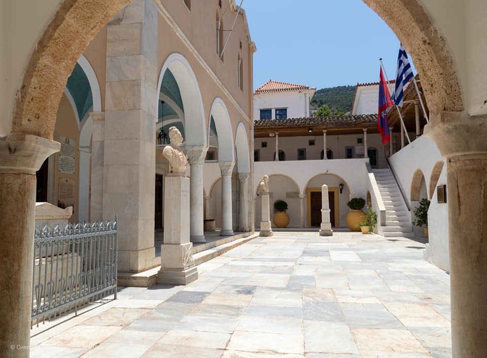 Στο προαύλιο μπορείτε να δείτε προτομές του Λάζαρου Κουντουριώτη, του Ανδρέα Μιαούλη, του Βασιλέως Γεωργίου Α΄ και του Αντώνη Λιγνού, φιλοτεχνημένες από τον Δημήτρη Φιλιππότη.