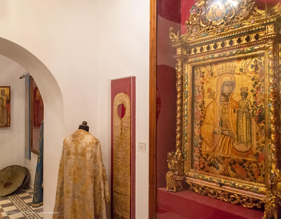 Φυλάσσονται σε ειδικές προθήκες κειμήλια του μοναστηριού, αφιερώματα, ιερές εικόνες που ανάμεσά τους ξεχωρίζει η εικόνα της Παναγίας «Ρόδο Αμάραντο», που τοποθετείται χρονικά γύρω στα 1774, άμφια, ιερά σκεύη, μουσικά χειρόγραφα, τούρκικα φιρμάνια, κ.α.