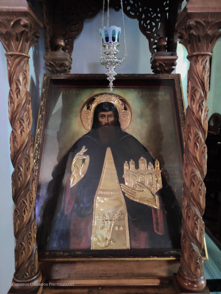 Στον εξωτερικό χώρο τον οποίο μπορούν να επισκεφθούν και οι γυναίκες, βρίσκεται η νέα μεγαλόπρεπης εκκλησία του Αγίου Διονυσίου. Στην είσοδο της μονής υπάρχει η μόνη σωζόμενη τοιχογραφία, η οποία απεικονίζει τον Άγιο Διονύσιο και χρονολογείται το 1911.