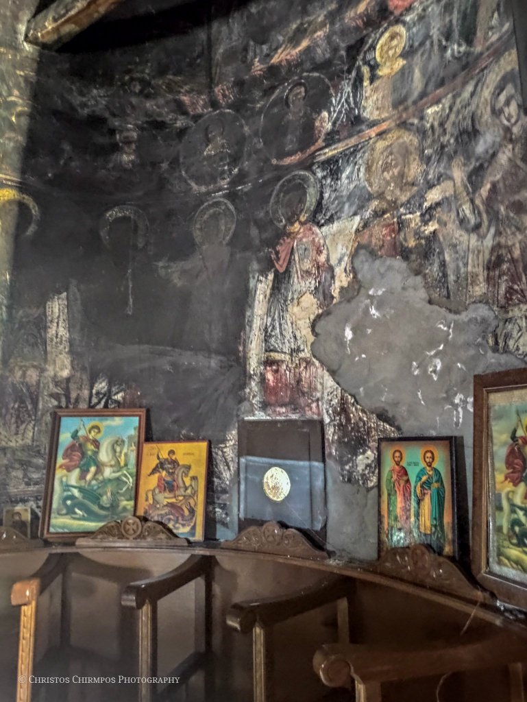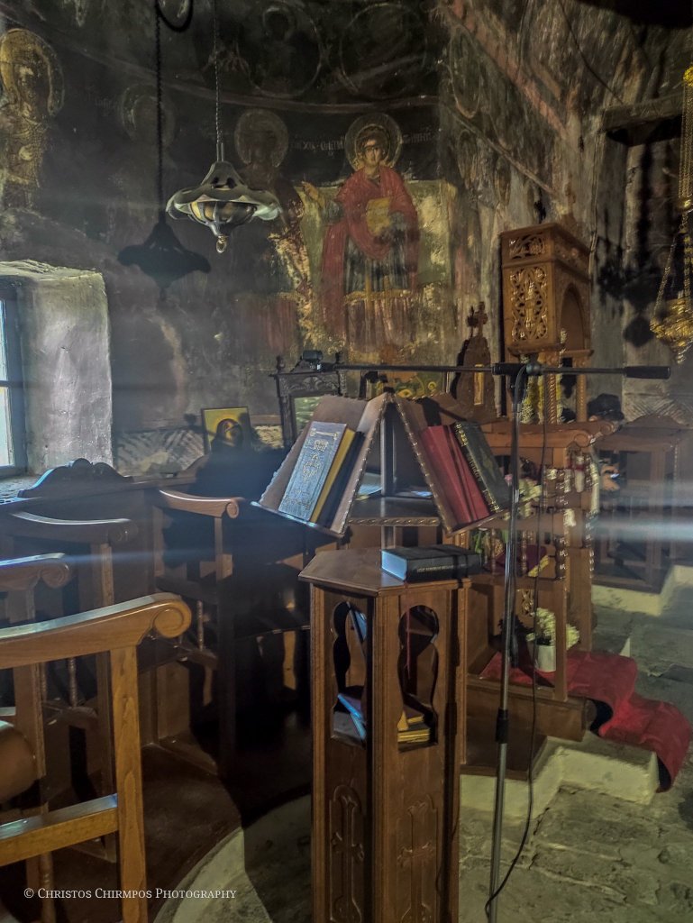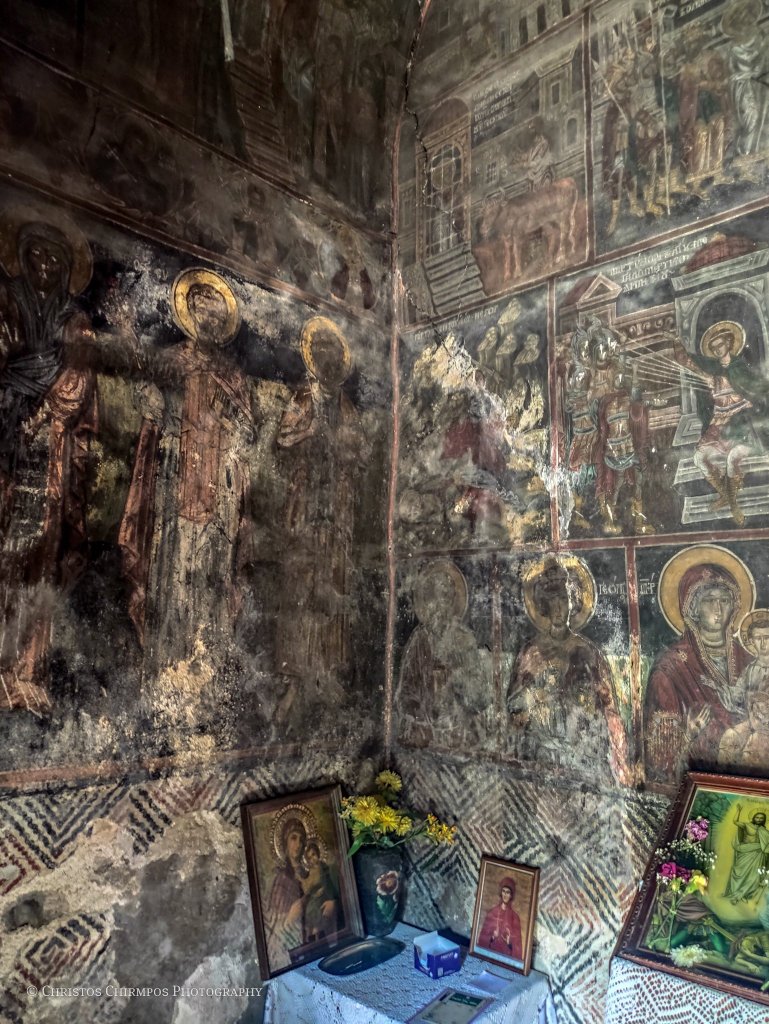 Εσωτερικά ο ναός είναι κατάγραφος από τοιχογραφίες του 1714, όπως μαρτυρεί σχετική επιγραφή γραμμένη πάνω απ’ τη θύρα του κυρίως ναού που οδηγεί στο νάρθηκα. Οι συνθέσεις παρουσιάζουν τη γνωστή διάταξη σε ζώνες τόσο στον κυρίως ναό όσο και στο νάρθηκα, και έγιναν από Καλαρρυτινούς ζωγράφους. Το ξυλόγλυπτο τέμπλο είναι επίσης του 18ου αιώνα και στολίζεται με ανάγλυφες παραστάσεις πτηνών και φυτών, έχει δε και πέντε φορητές εικόνες που απ’ ό,τι δείχνει η τεχνοτροπία τους πρέπει να έγιναν απ’ τους ίδιους ζωγράφους που έκαναν και τις τοιχογραφίες.