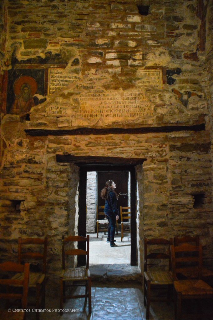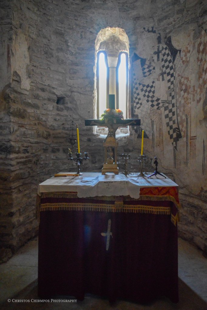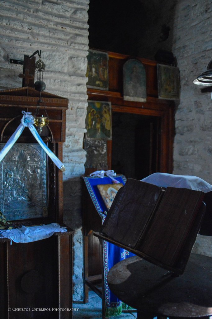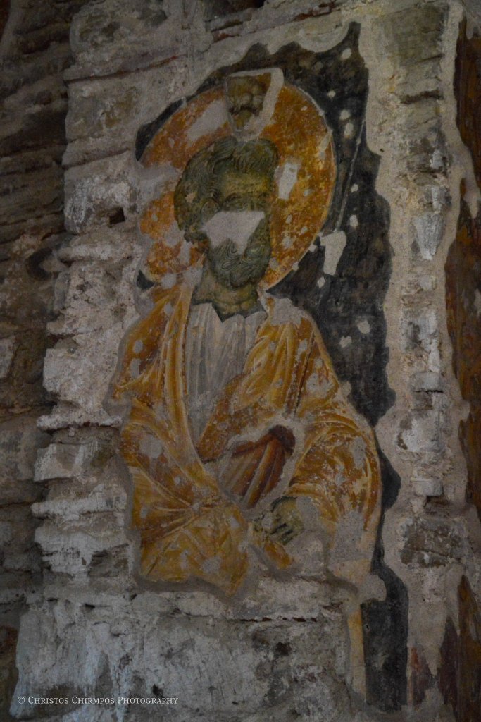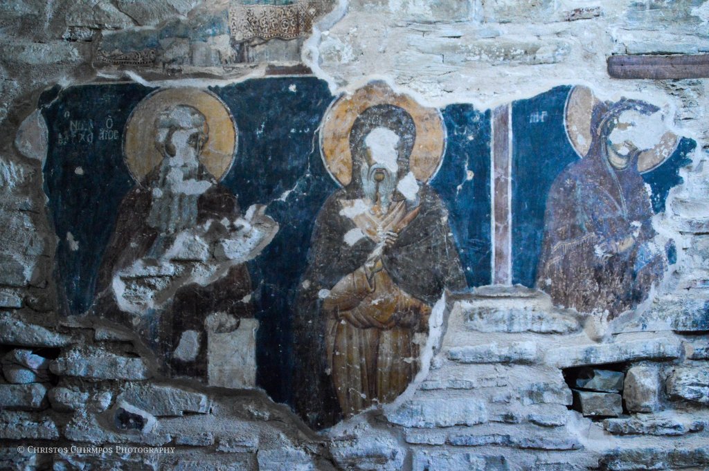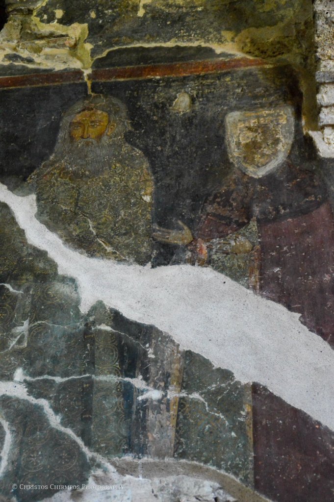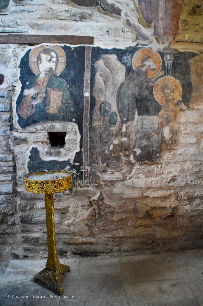 Εκτός όμως από την ιδιαίτερη αρχιτεκτονική, εξίσου σημαντικά είναι και τα ευρήματα στο εσωτερικό του Ναού. Πρόκειται για τα σωζόμενα τμήματα του αρχικού γύψινου τέμπλου αλλά και σπαράγματα του τοιχογραφικού του διακόσμου, τα οποία μάλιστα αποτελούν και το μοναδικό χρονολογημένο με επιγραφή, τοιχογραφικό σύνολο του «Δεσποτάτου της Ηπείρου». Πιο συγκεκριμένα, στην ανατολική πλευρά του νάρθηκα, σώζεται η τοιχογραφία των δωρητών του ναού. Στο κέντρο, δεσπόζει η Θεοτόκος ένθρονη, βρεφοκρατούσα, πλαισιωμένη από δύο αγγέλους. Κάτω από το υποπόδιό της, σε μικρότερη κλίμακα, διακρίνονται κεφαλές αγίων καθώς και δύο ζεύγη λαϊκών. Πρόκειται για τον πρωτοστράτορα Θεόδωρο Τσιμισκή, συνοδευόμενο από τη σύζυγό του Μαρία, ο οποίος κρατά στο αριστερό του χέρι ομοίωμα του ναού, με ψηλό τρούλο και το προσφέρει στη Θεοτόκο.