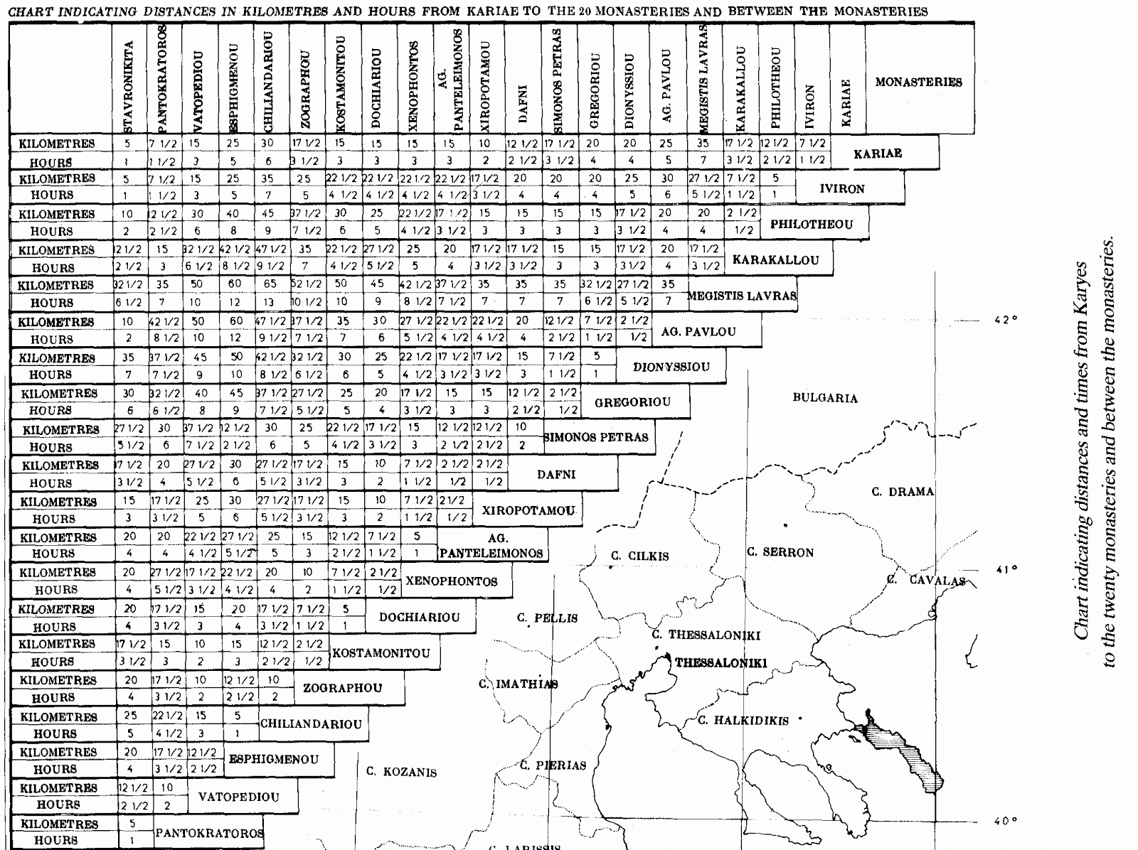 Ο πίνακας παρακάτω δείχνει την διαφορά από τα 20 μοναστήρια σε »ώρες» και σε »χιλιομετρικές αποστάσεις».