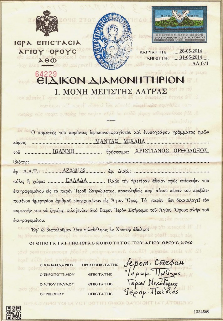 - Άδεια εισόδου στο Όρος από το Υπουργείο Εξωτερικών της Αθήνας (Διεύθυνση Εκκλησιαστικών Υποθέσεων) ή από το Υπουργείο Βορείου Ελλάδος της Θεσσαλονίκης (Διεύθυνση Εξωτερικών Υποθέσεων).